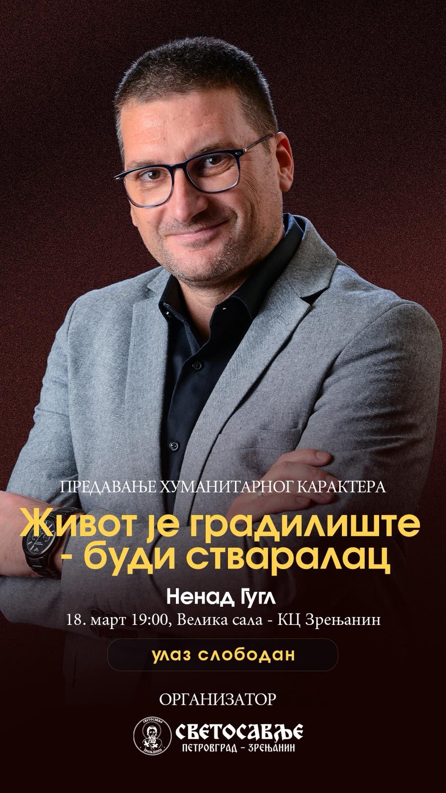 Сви градимо нешто у животу.Питање је — да ли остајемо ствараоци?Предавање које инспирише, оснажује и мења перспективу.📍 КЦ Зрењанин | 🕖 18. март 2026. у 19 часова | Улаз слободан